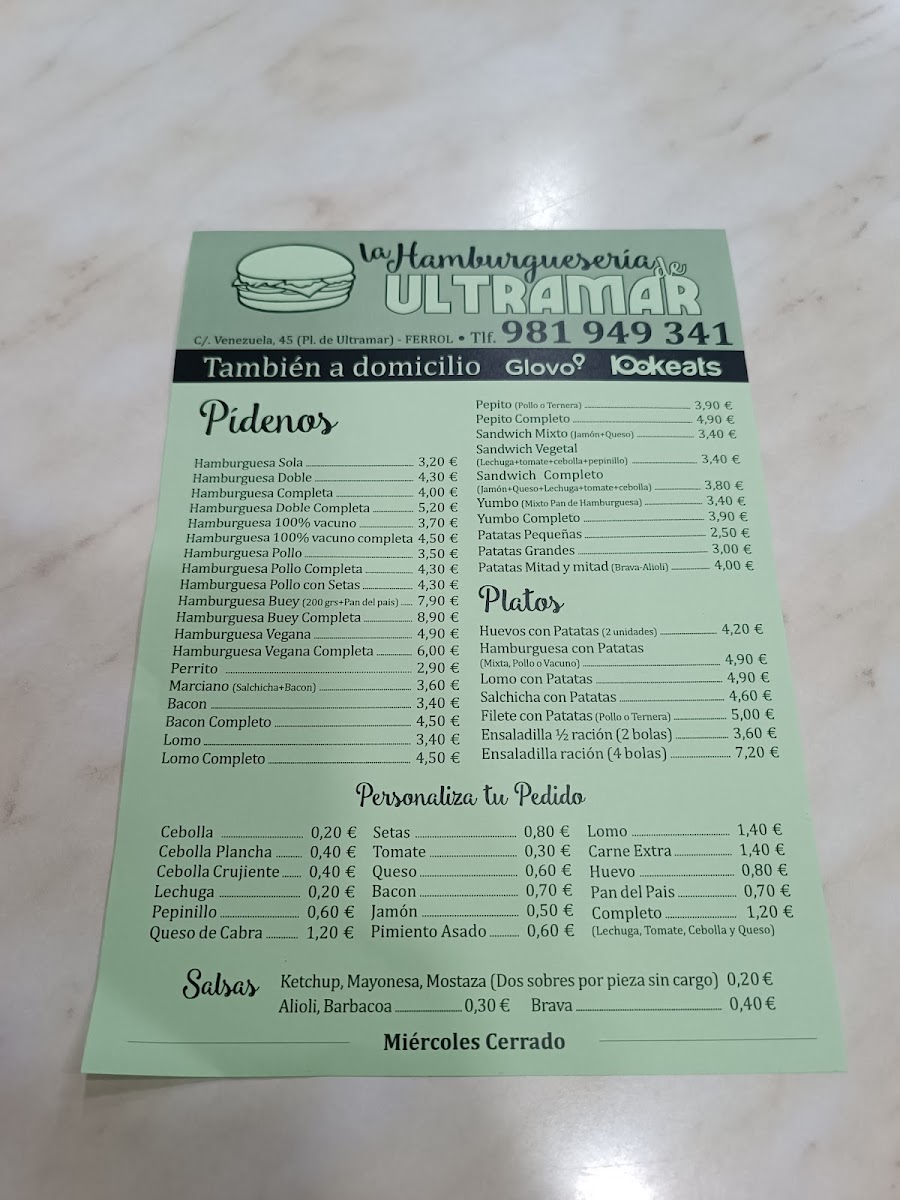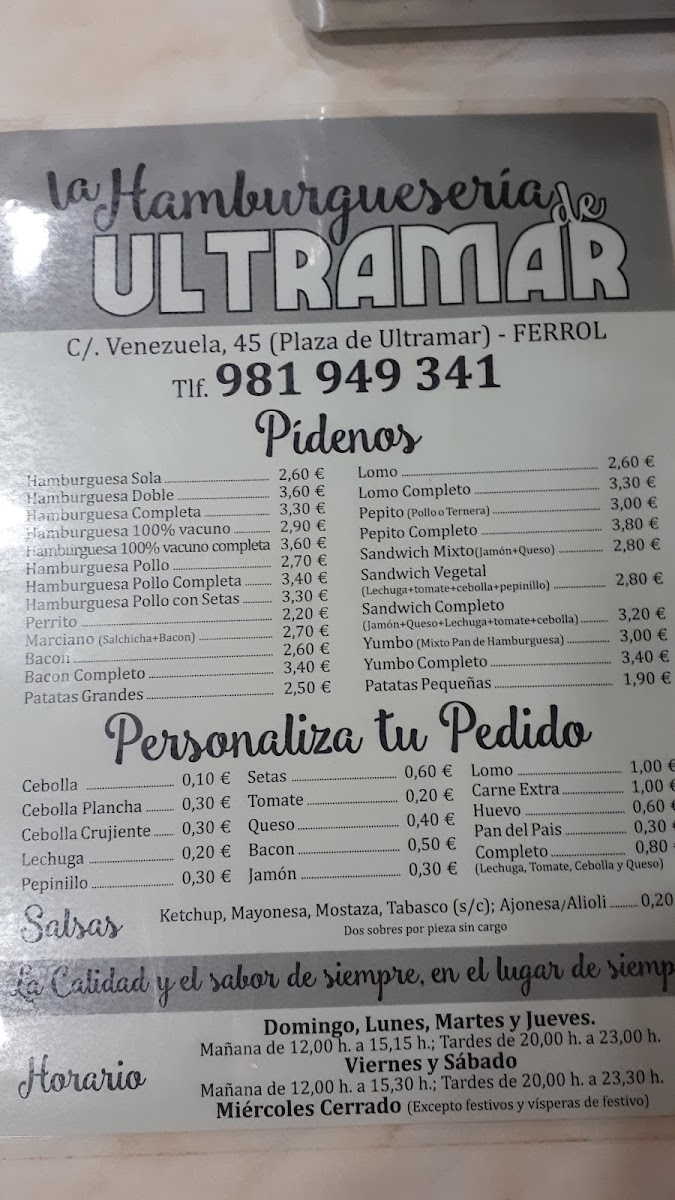 Welcome to La Hamburgueseria de Ultramar, located at Rua Venezuela, 45 in Ferrol, A Coruña. Celebrated as one of the most iconic burger joints in town, this establishment has been delighting customers for years with its exceptional hamburgers and sandwiches.